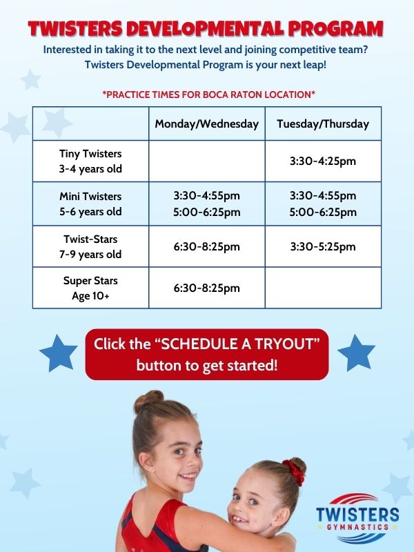 Call our customer service team for more information about the Boca Twisters Developmental Program!